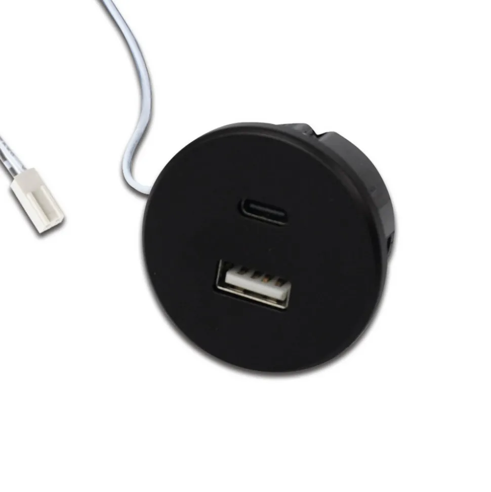 USB-A stikkontakt + USB-C, svart møbelinstallasjon 24V inngang 20W