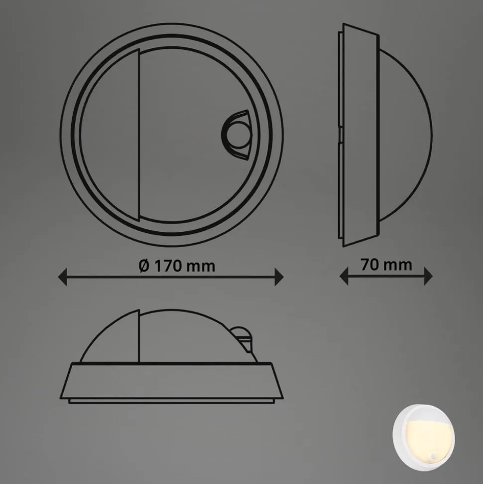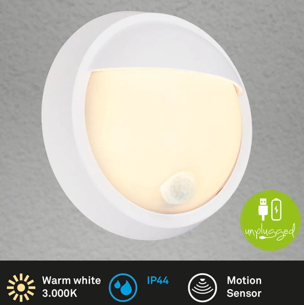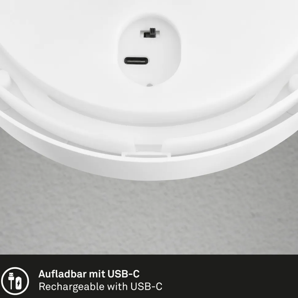 Rund utendørs vegglampe med oppladbart batteri og sensorstyring Denne runde utendørs vegglampen med LED-lampe i plast er en praktisk lyskilde for uteområder. Den er utstyrt med et oppladbart batteri, slik at det ikke er behov for en fast strømtilkobling. Den integrerte bevegelses- og skumringssensoren sørger for automatisk tenning. I mørket aktiveres lyset bare så snart personer er aktive i en avstand på maks. 8 meter, og lyset forblir på i 20 sekunder. Manuell betjening via bryter på lyset er også mulig – Kapslingsgrad: IP44 – Inkluderer USB-C-ladekabel – Kan tas av veggfeste for lading i tørre innendørsrom – Skumringsterskel justerbar: 5 til 25 lx – Ladetid 6 timer, belysningstid 4,5 timer