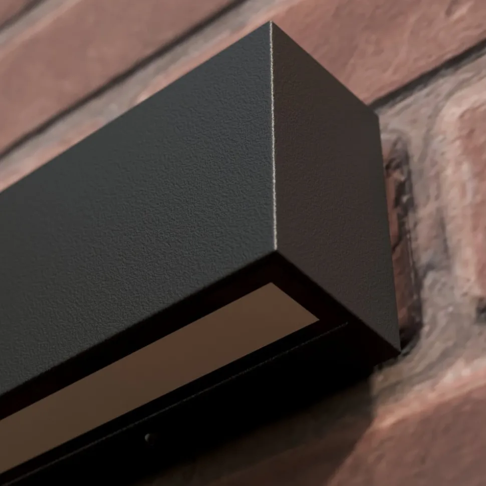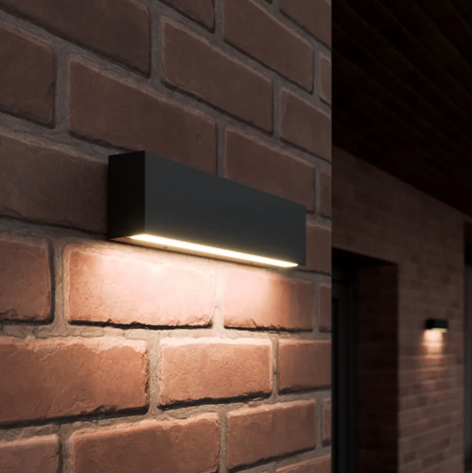 Rektangulær utendørs LED-vegglampe Elvira Elvira har en veldig enkel design, slik at den ikke bare passer til mange stiler, men også ser ekstremt moderne ut. Overflaten på aluminiumskroppen har en grafittgrå finish. LED-lampene er et merkevareprodukt fra Toshiba og har lang levetid og er energieffektive.
