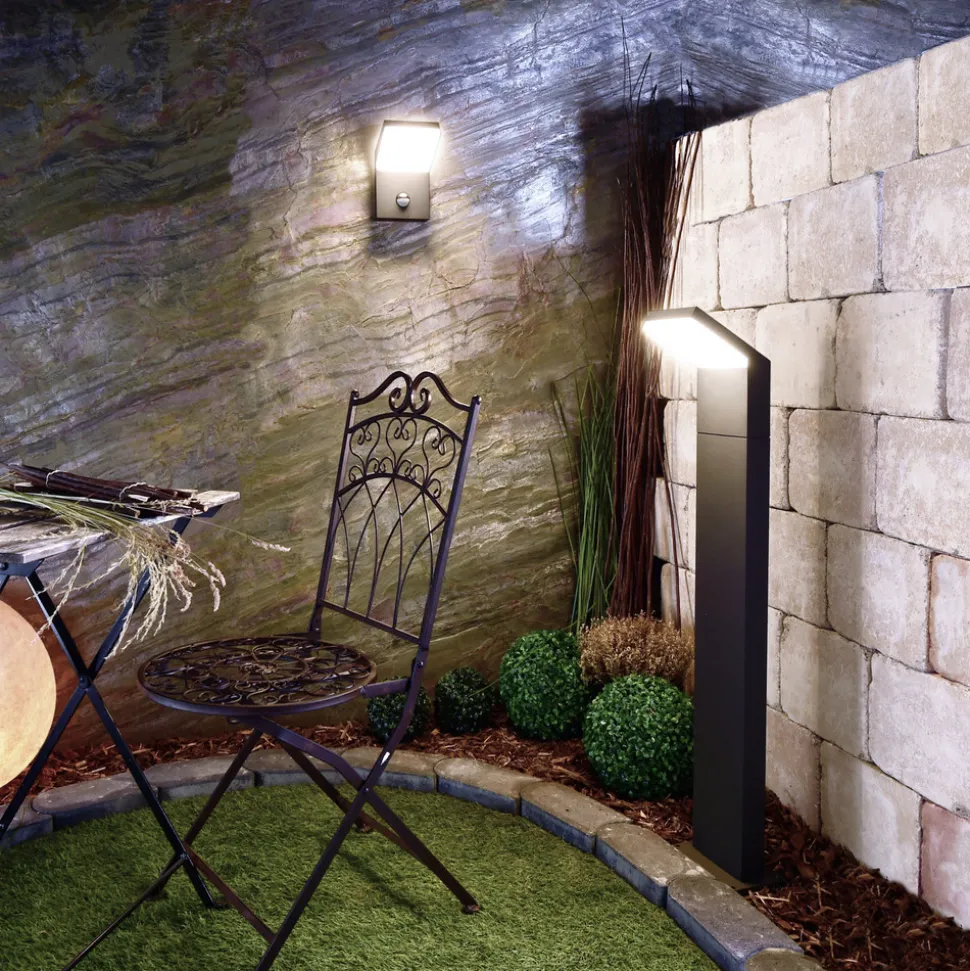 Moderne utendørs LED-vegglampe Tucanae i mørk grå metallic med sensorstyring Utendørs LED-vegglampen Tucanae er laget av aluminium og passer perfekt inn i moderne utendørsinstallasjoner med sin mørkegrå metallic-finish (RAL 840-M) og rektangulære design. Den øvre, vinklede delen er utstyrt med en varmhvit LED-enhet som sender ut lys gjennom en hvit diffusor. Takket være bevegelsessensor og dagslyssensor kan lyset slås av og på automatisk etter behov – Kapslingsgrad: IP54 – Justerbar skumringsterskel – Bevegelsessensor: rekkevidde maks. 10 m, registreringsvinkel 120° – Innstillbar skumringsgrense