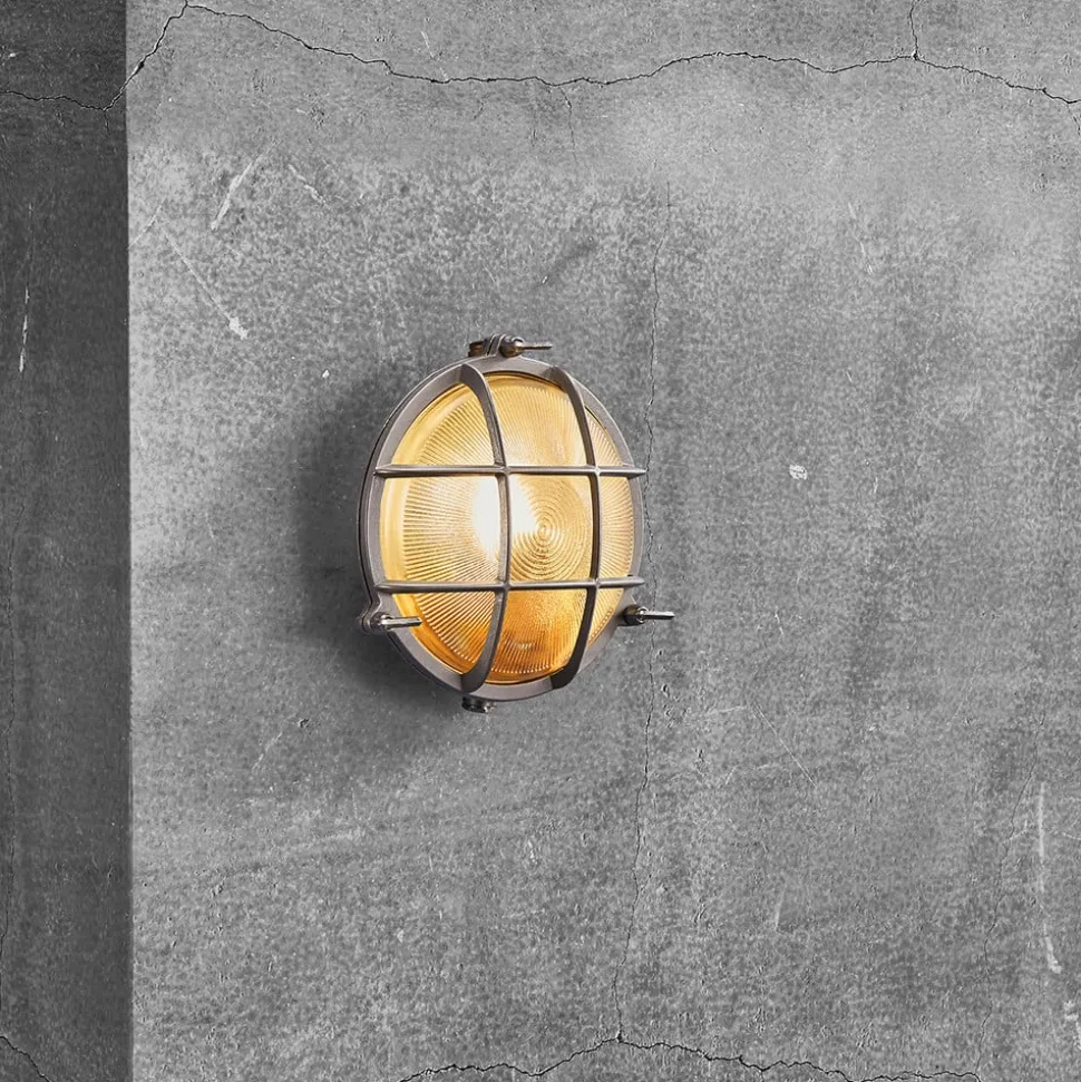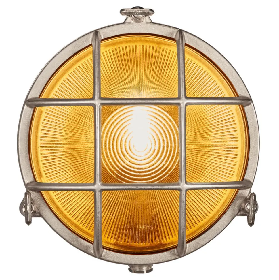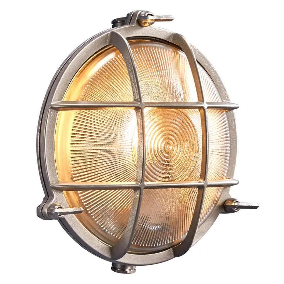 Rammen til den runde utendørs vegglampen Polperro er laget av messing med nikkelbelegg. Den er utstyrt med tre dekorative skruer og et beskyttelsesgitter. Avrundet med korrugerte glassdeksel, er resultatet en maritim, rustikk utvendig vegglampe, som med sin optikk er spesielt effektiv på fasader av steinbygninger og på grove klinkstein og, takket være beskyttelsen mot sjøvann, også kan installeres på bygninger nær sjøen.