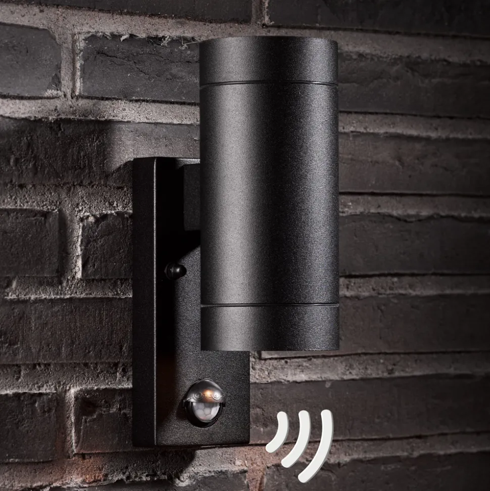 Svart utvendig vegglampe Tin Maxi Sensor – skinner oppover og nedover