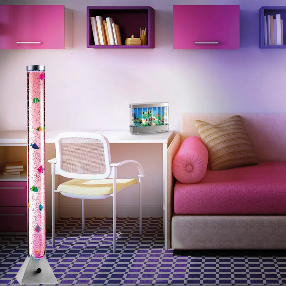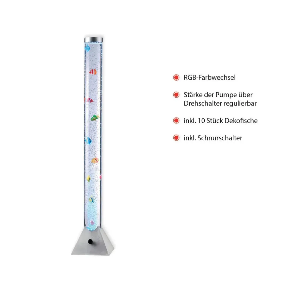 Lysende Ava-vannsøyle med LED-fargeskifter og dekorativ fisk Ava LED-vannsøyle gir stemningsfull ekstrabelysning med sitt dekorative utseende. De røde, gule og blå fiskene som ser ut til å svømme rundt i vannsøylen, ser veldig søte ut og kan være et godt alternativ til et ekte akvarium, som selvsagt er mye mer vedlikeholdskrevende. Mottoet her er ganske enkelt: slå på, se på og nyt! Og en ting til må nevnes – hvilket klassisk akvarium er utstyrt med en RGB-fargeskifter? Riktignok er dette unntaket snarere enn regelen, men Ava kan score poeng som dekorativt lys og bidrar til en god atmosfære i rommet, enten det er i stuen, i de smås rike eller til og med i gangen. Det dekorative lyset betjenes med en ledningsbryter.