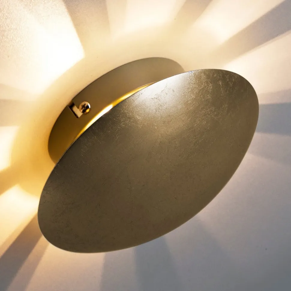 vegglampe Sunset laget av metall kombinerer en tidløs rund form med en edel gylden finish. Lyset reflekteres fra baksiden av det konvekse, skiveformede dekselet og skaper et strålemønster på veggen. Dette skaper et utseende som minner om solen. Sunset er det ideelle blikkfanget for aksent og ekstra belysning for private innendørsområder.