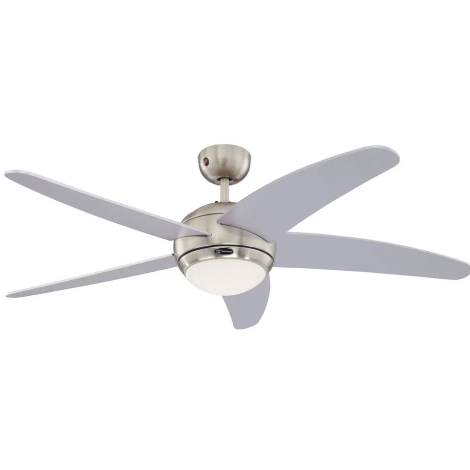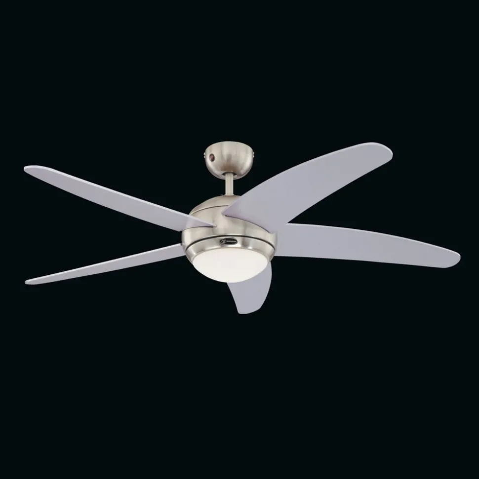 Den elegante takviften Bendan har avrundede vinger i moderne sølv. Under det opalhvite melkede glasset sørger en halogenpære for behagelig lys. Fjernkontroll for vifte og belysning samt pære er inkludert i leveransen. En veggbryter kan brukes som ekstrautstyr (se tilbehør). Egnet for rom opptil 30 m².