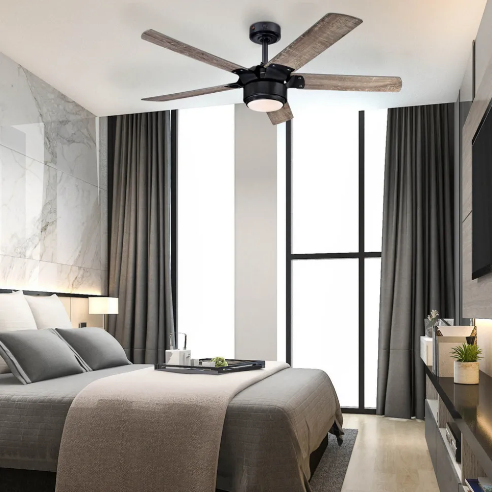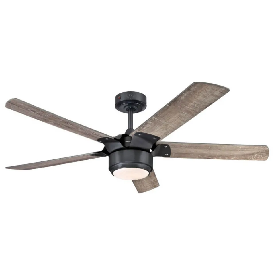 De fem vingene på takviften Morris fortryller med sin eik-look og passer perfekt inn i motorhuset av jern, som er festet med metallbeslag. En opalvit glasskjerm brukes som deksel for det integrerte LED-modulet. Montering uten den medfølgende mellomstangen er ikke mulig.