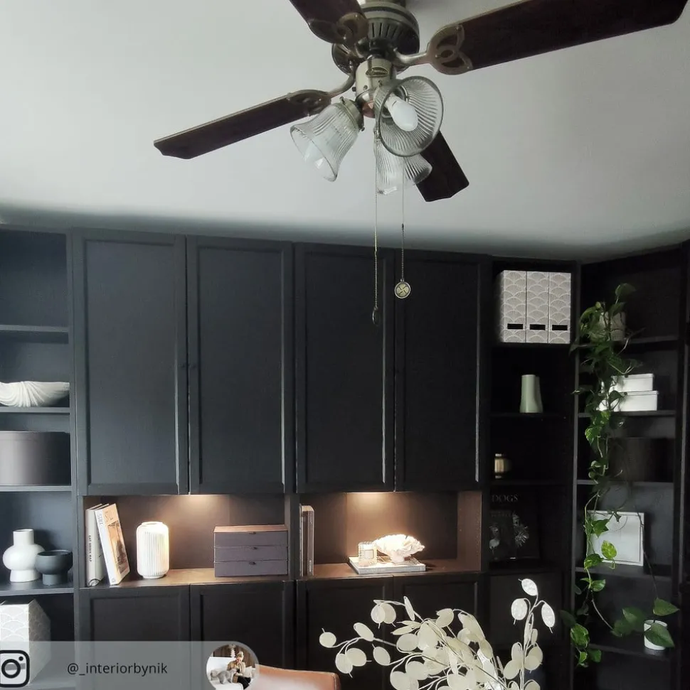 Utstyrt med vendbare blader i eike- eller mahognitre-look.