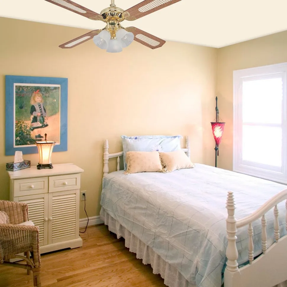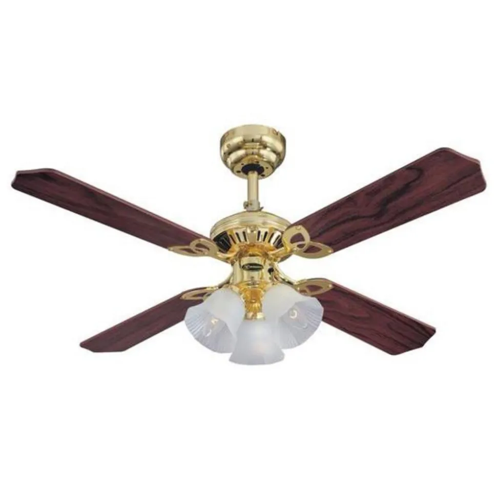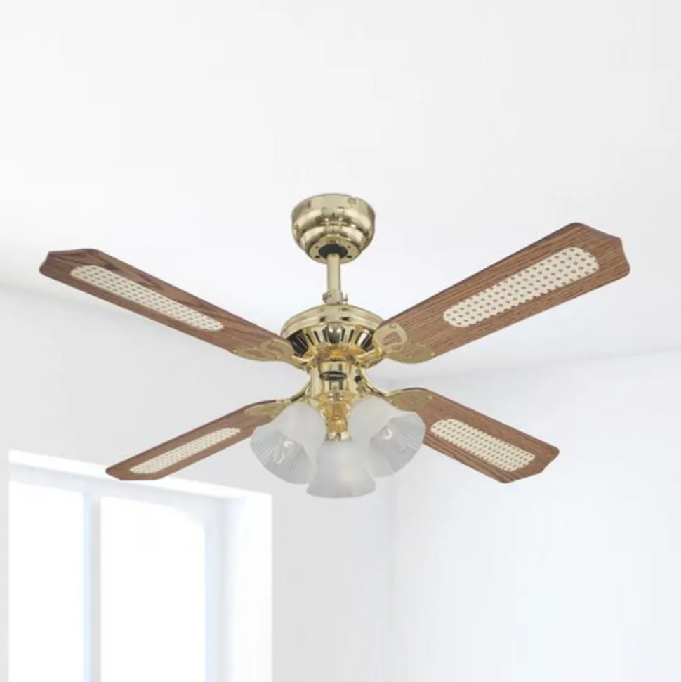 Stilig takvifte Princess Trio i tre- og rottinglook Den dekorative takviften Princess Trio imponerer med sitt elegante design med metallhus i polert messing. Viften har fire reversible blader med rottingapplikasjoner og et heltrekkende, fint treutseende i eik eller mahogny. De skaper en stilig atmosfære. Princess Trio-funksjonene er utstyrt med belysning: Tre fortryllende lampeskjermer i elegant satinert glass sørger for stemningsfull belysning. Lyskildene er ikke inkludert i leveransen. Den tretrinns viften kan betjenes med trekkbryteren. Hvis takhøyden er 350 cm eller mer, anbefales det å bruke et passende forlengelsesprogram (se tilbehør). Forover- eller reversfunksjonen – som kan justeres via den integrerte glidebryteren – brukes til å veksle mellom sommer- og vinterdrift. Sommerfunksjonen brukes til avkjøling i varmt vær, mens vinterfunksjonen bruker varmesirkulasjon for å spare opptil 30 % av oppvarmingskostnadene. Tekniske data Effekt: 45/32/23 watt Turtall: 210/145/85 o/min Spesielle egenskaper Takket være den ekstremt stillegående motoren er Princess Trio takvifte også egnet for bruk i soverom.