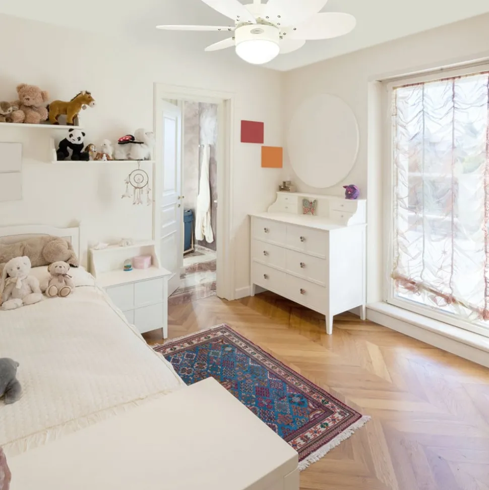 Turbo II-takvifte er en flott enhet som er spesielt egnet for barnerom. Den lille diameteren på 76 cm gir ytelse for rom på opptil 12 m². Turbo II imponerer ved å bruke den dyptliggende motorboligen med hvit glasskjerm som tilleggslampe. Viftebladene kommer i hvit eller flerfarget, pastellfarget eller furustil. Dette skaper et positivt blikkfang i taket.