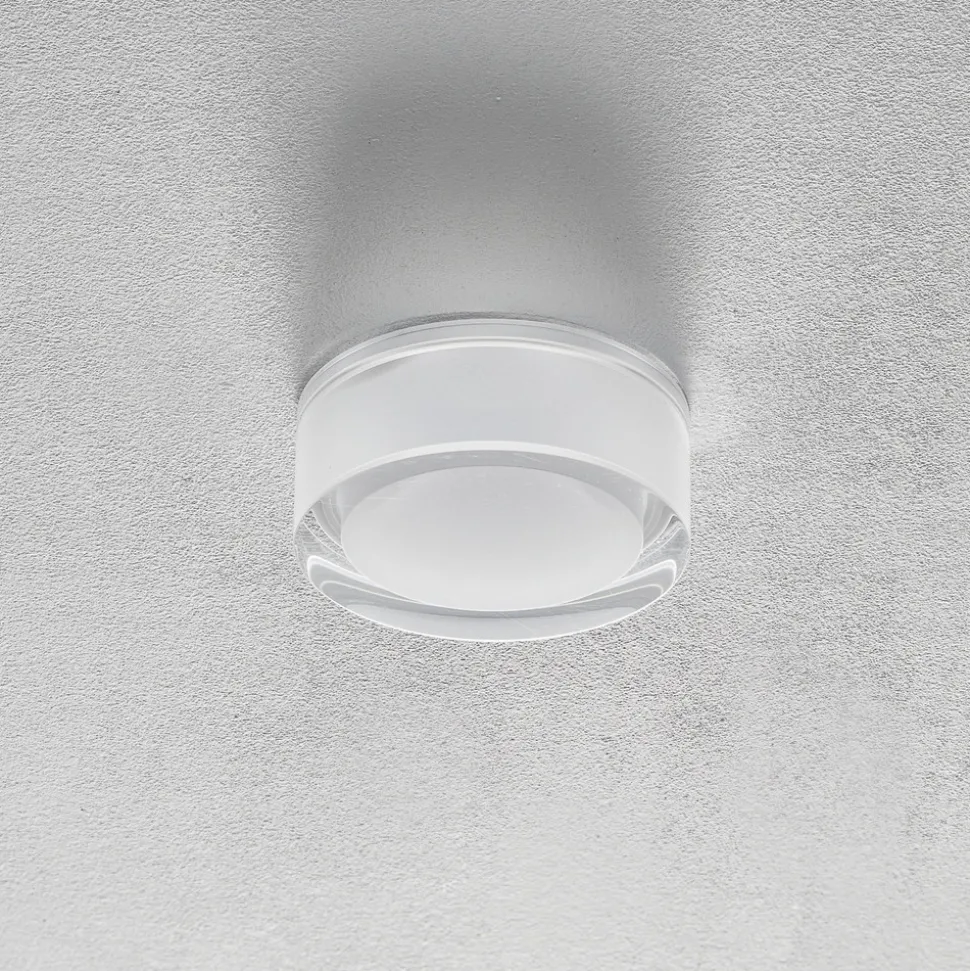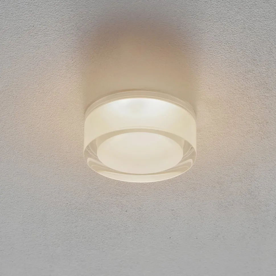 Rund innfelt LED-taklampe Mirbi 1.0 – dimbar Denne innfelte LED-taklampen Mirbi 1.0 er takket være kapslingsgrad IP44 (beskyttelse mot sprutvann) også beregnet for bruk på bad og andre rom der det forekommer fukt. Den moderne, delvis klare og delvis opale plastskjermen, som avgir varmhvitt lys hele veien rundt, har en spesielt dekorativ effekt. En innfelt taklampe som kan harmonere med mange innredningsstiler. Lysintensiteten kan reguleres ved hjelp av en ekstern dimmer. – Takets tykkelse: 2-25 mm – svært god fargegjengivelse