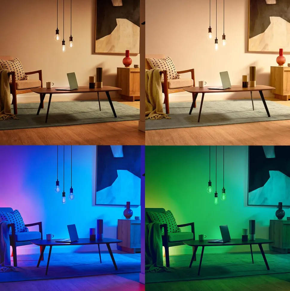 Smart styrbar WiZ E27 LED globe G95 6,3 W RGBW i dekorativt glødetrådsutseendeTradisjonelle armaturer som gir et glimt av stikkontakten kan oppgraderes på en smart måte med denne LED-lampen. Lampen i klar globeform G95 er utstyrt med LED-glødetråder som gir varmhvitt til dagslyshvitt lys samt utallige fargeskalaer med dimbar lysstyrke. Disse kan justeres fritt etter ønske eller velges i form av forhåndskonfigurerte scener. Alle innstillinger kan gjøres via appen på nettbrettet/smarttelefonen, og det finnes også muligheter for styring via fjernkontroll, stemmestyring og smarthussystemer.Spesielle egenskaper/kompatibilitet:- over 64 000 nyanser av hvitt (varmhvitt til dagslys) og 16 millioner fargede lysfarger kan stilles inn- kan integreres via WLAN; bridge eller gateway er ikke nødvendig- kan styres med smarttelefonen eller nettbrettet med WiZ-appen- kan alternativt styres med WiZ-fjernkontroll (se tilbehør)- stemmestyring med Amazon Alexa, Apple HomeKit (Siri) eller Google Assistant mulig- ulike appfunksjoner: direkte kobling, dimming, dimbar lysstyrke og dimbare scener. Appfunksjoner: direkte kobling og dimming, lagring av populære scener, tilordning av lamper til rom/grupper, oppretting av tidsplaner, valg av forhåndsinnstilte lysmoduser/scener, tilordning av flere brukere og tildeling av tilgangsrettigheter, drift av opptil 10 000 WiZ-lamper