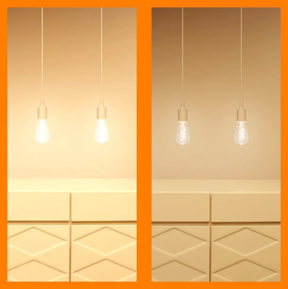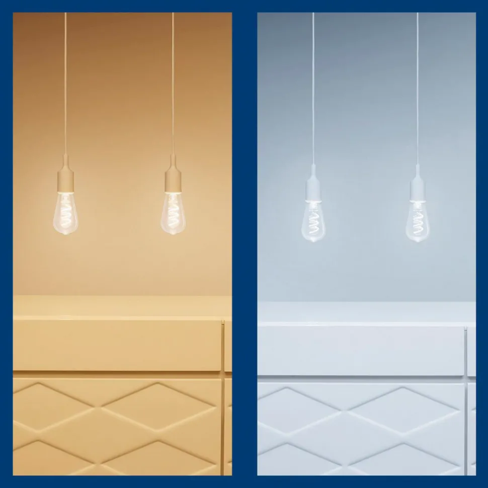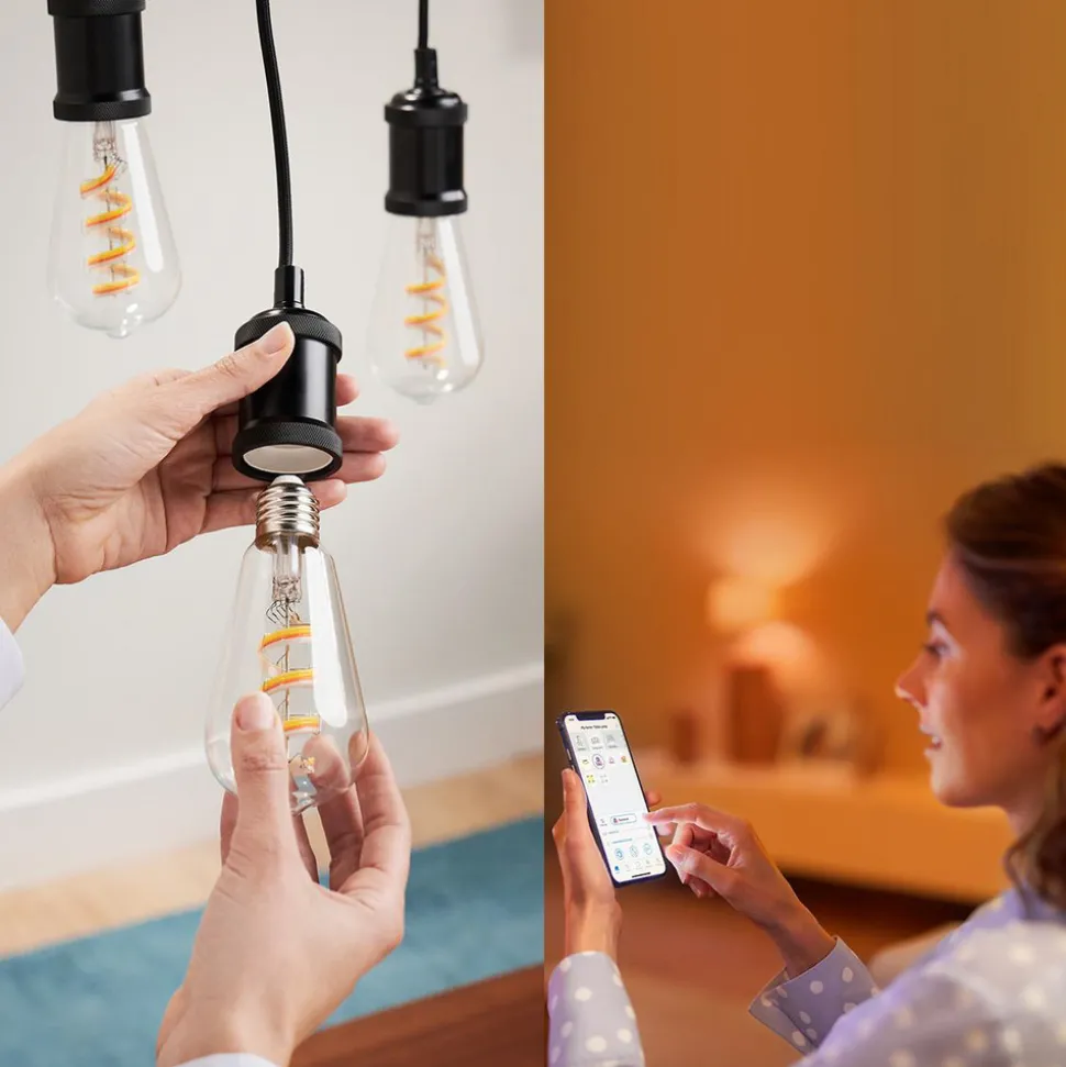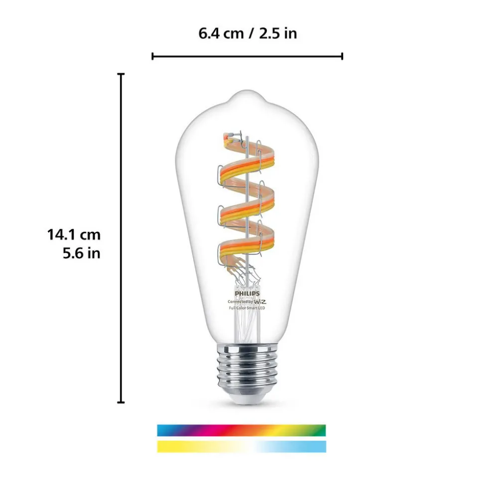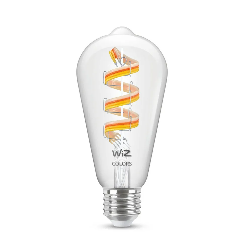 Smart styrbar WiZ E27 LED-rustikklampe ST64 6,3 W RGBW i dekorativ filamentoptikkSelv konvensjonelle armaturer som gir et glimt av sokkelen kan oppgraderes på en smart og visuelt tiltalende måte med denne LED-lampen. Den klare, rustikke ST64-lampen er utstyrt med LED-filamenter som gir varmhvitt til dagslyshvitt lys og utallige fargeskalaer med dimbar lysstyrke. Disse kan justeres fritt etter ønske eller velges i form av forhåndskonfigurerte scener. Alle innstillinger kan gjøres via appen på nettbrettet/smarttelefonen, og det finnes også muligheter for styring via fjernkontroll, stemmestyring og smarthussystemer.Spesielle egenskaper/kompatibilitet:- over 64 000 nyanser av hvitt (varmhvitt til dagslys) og 16 millioner fargede lysfarger kan stilles inn- kan integreres via WLAN; bridge eller gateway er ikke nødvendig- kan styres med smarttelefonen eller nettbrettet med WiZ-appen- kan alternativt styres med WiZ-fjernkontroll (se tilbehør)- stemmestyring med Amazon Alexa, Apple HomeKit (Siri) eller Google Assistant mulig- ulike appfunksjoner: direkte kobling, dimming, dimbar lysstyrke og dimbare scener. Appfunksjoner: direkte kobling og dimming, lagring av populære scener, tilordning av lamper til rom/grupper, oppretting av tidsplaner, valg av forhåndsinnstilte lysmoduser/scener, tilordning av flere brukere og tildeling av tilgangsrettigheter, drift av opptil 10 000 WiZ-lamper
